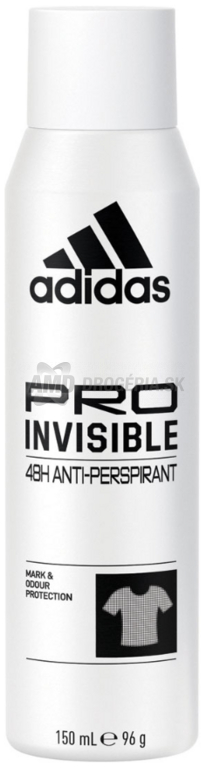 Adidas Pro Invisible dámsky antiperspirant v spreji (150 ml) poskytuje až 48-hodinovú ochranu pred telesným zápachom a zároveň chráni oblečenie pred vznikom bielych a žltých škvŕn – ideálny na čierne aj biele kúsky oblečenia.
