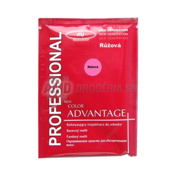 VELLIE COSMETICS - ADVANTAGE CONTRAST - RUŽOVÝ 15g prípravok pre melírovanie vlasových pramienkov * ružový odtieň na tmavých vlasoch * dosahuje veľmi intenzívnych farebných odtieňov * farbiaci prášok - vankúšik 15g * Upozornenie: k melírovacímu prášku je nutné dokúpiť peroxid 6% alebo 9% podľa požadovanej farebnej intenzity