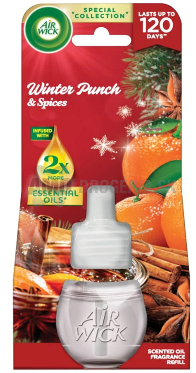 Air Wick tekutá náplň do elektrického osviežovača vzduchu Zimný punč (19 ml) je ideálna pre vytvorenie útulnej a hrejivej atmosféry počas chladných zimných večerov. Obsahuje zložky na prírodnej báze obohatené o esenciálne oleje, ktoré prinášajú autentický zážitok z vône. Vôňa zimného punču, plná teplých a korenistých tónov, je ideálna pre prevoňanie vášho domova, aby ste sa cítili pohodlne a príjemne.