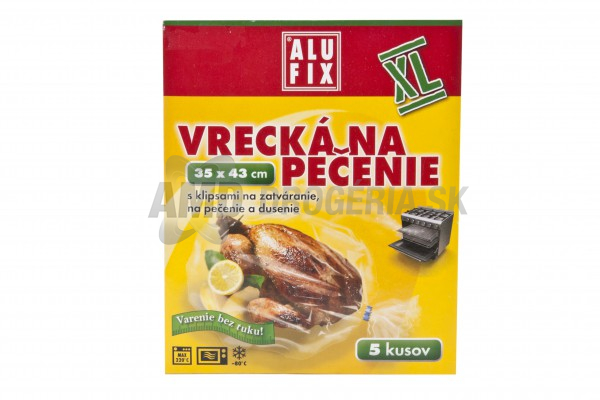 Pät vreciek na pečenie rozmeru 43x35 cm, s klipsami na zatváranie. Zdravé varenie bez tuku. Použiteľné v rozsahu teplôt -30°C až +200°C, vhodné do mikrovlnnej rúry.