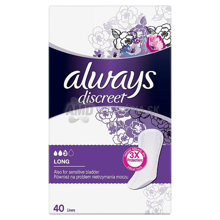 Pre prípady, keď treba o niečo lepšiu ochranu, je tu inkontinenčná vložka Always Discreet, vhodná aj pre citlivý močový mechúr. Tieto vložky majú technológiu neutralizácie zápachu, vďaka ktorej poskytujú pocit istoty, spoľahlivosti a sviežosti. ,