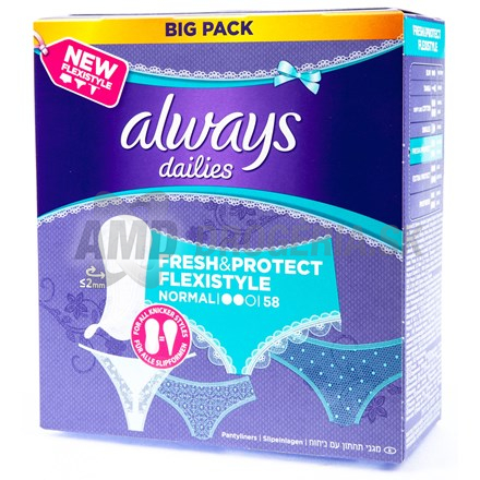 Zachovajte si pocit sviežosti, nech máte akýkoľvek štýl. Slipové vložky Always dailies Fresh & Protect Flexistyle sa prispôsobia každému typu nohavičiek. Sú priedušné, jemné a pri pohybe ich takmer necítiť. Vďaka technológií na neutralizáciu zápachu budete mať pocit sviežosti a pohodlia po celý deň. Cíťte sa sviežo po celý deň so slipovými vložkami Always dailies!