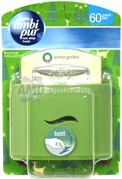 Osviežovač vzduchu Ambi Pur Non Stop Fresh Winter Garden eliminuje nepríjemný zápach a dodá sviežu vôňu zimnej záhrady. Ideálny do malých až stredne veľkých miestností. Nonstop sviežosť, až 60 dní nepretržitej svieža vôňa. Používajte iba s vonnými náplňami Ambi Pur Non Stop Fresh pre neustálu sviežosť.