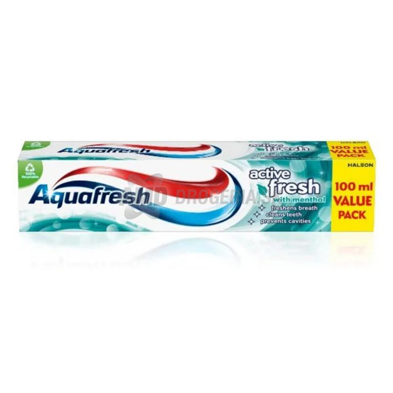 Aquafresh Active Fresh je klasická trojfarebná zubná pasta s fluoridom, ktorá pomáha chrániť zuby pred zubným kazom a zároveň osviežuje dych. Vhodná je na každodennú ústnu hygienu celej rodiny od dospelých až po staršie deti.