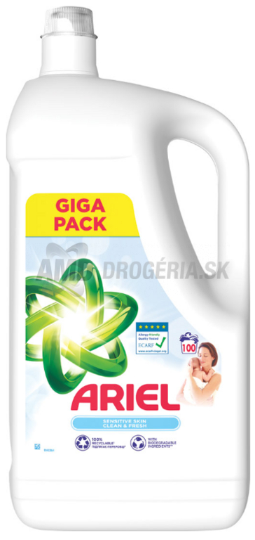 - Jemné zloženie: Ariel Sensitive Skin Clean & Fresh je dermatologicky testovaný a schválený ECARF. Nefarbí a je formulovaný tak, aby bol šetrný k citlivej pokožke. Zachováva jenosť oblečenia, ktoré prichádza do kontaktu s pokožkou.