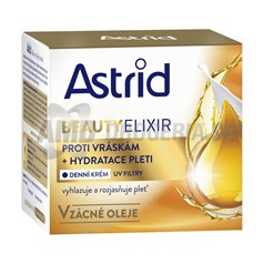 Astrid Beauty Elixir hydratačný denný krém proti vráskam v sebe spojuje silu troch vzácnych olejov (arganového, makadamového a mandľového), ktoré majú jedinečné vyživujúce, zvláčňujúce a ochranné vlastnosti. Dokonale hydratuje a vyhladzuje pleť, zanecháva ju hodvábne jemnú a rozjasnenú. Zloženie obohatené o PRO-ELASKIN, unikátny komplex proti vráskam a starnutiu pleti, pomáha podporiť tvorbu kolagénu a elastínu v pokožke, zlepšuje jej pružnosť a pevnosť a prispieva k udržaniu optimálnej hladiny hydratácie. Obsiahnuté UV filtre pomáhajú chrániť pleť pred slnečným žiarením, predčasným starnutím a tvorbou vrások.