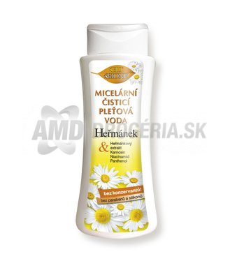 Unikátna odličovacia pleťová voda v BIO formulácii bez konzervačných látok, bez parabénov, bez tenzidov, bez parfumov, bez silikónov, ropných produktov, a i. Pritom s výbornou čistiacou účinnosťou pre všetky typy pokožky. Obsahuje harmančekový extrakt s aktívnymi látkami, ako sú azulény, apigenin, quercetin, bisabolol, matricin, laktóny, glykozidy a ďalšie zložky priaznivé pre tonizáciu a upokojenie pokožky.