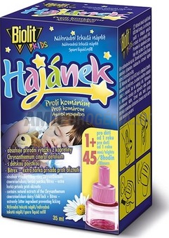 Náhradná tekutá náplň je určená pro elektrický odparovač Biolit Kids. Ničí a odpudzuje komáre a iný malý hmyz. Je určená pro použitie v detských izbách a miestach, kde se vyskytujú detii. 45 nocí po 8 hodinách.