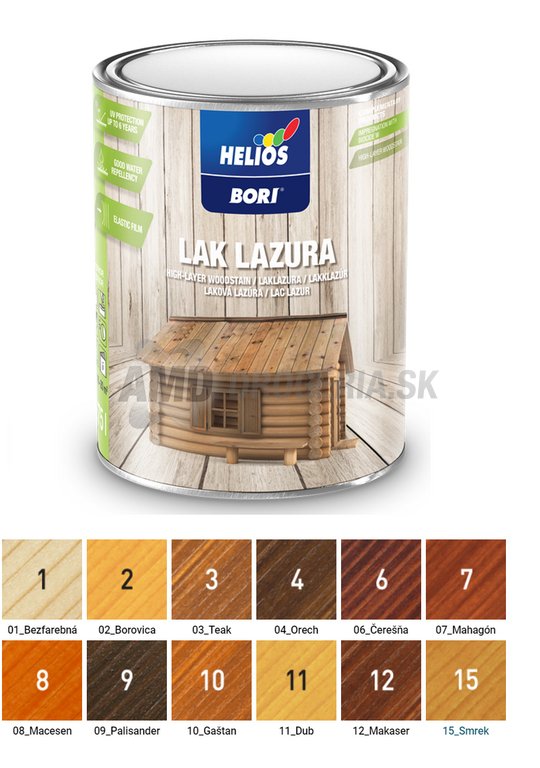 BORI laková lazúra UV PROTECTION - Mimoriadny dekoratívny a ochranný vrchný náter, používaný v exteriéri aj interiéri. Ochraňuje povrch pred poveternostnými vplyvmi a UV žiarenia. Obsahuje vosky, ktoré zvyšujú hydrofóbnosť náterového filmu.