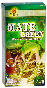 Zloženie: Mate green čaj (cezmína paraguajská list). Mate green je národný juhoamerický nápoj. Pochádza z Brazílie, Argentíny. Obsah kofeínu je 6,5%, čo je asi o 1,5% viac ako v káve, alebo čaji. Mate obsahuje rad vitamínov, bielkoviny, magnézium, železo, sodík, fluór a ďalšie, pre ľudský organizmus dôležité látky. Maté má pvzbudivé účinky, pôsobí močopudne, podporuje trávenie a napomáha redukovať telesnú hmotnosť. Pôsobí na nervový systém tráviaceho traktu. Napomáha vylučovať prebytočnú vodu z tela. Znižuje krvný tlak. Posilňuje krvný obeh v cievnych stenách a tým napomáha k ich dobrej funkcii. List maté je bežne konzumovaný ako nápoj, obsahuje menej trieslovín než čínsky čaj. Príprava: 1 čaj. lyžička na 1,5 dl. vriacej vody, lúhovať 2-5 minút.