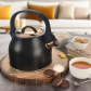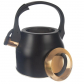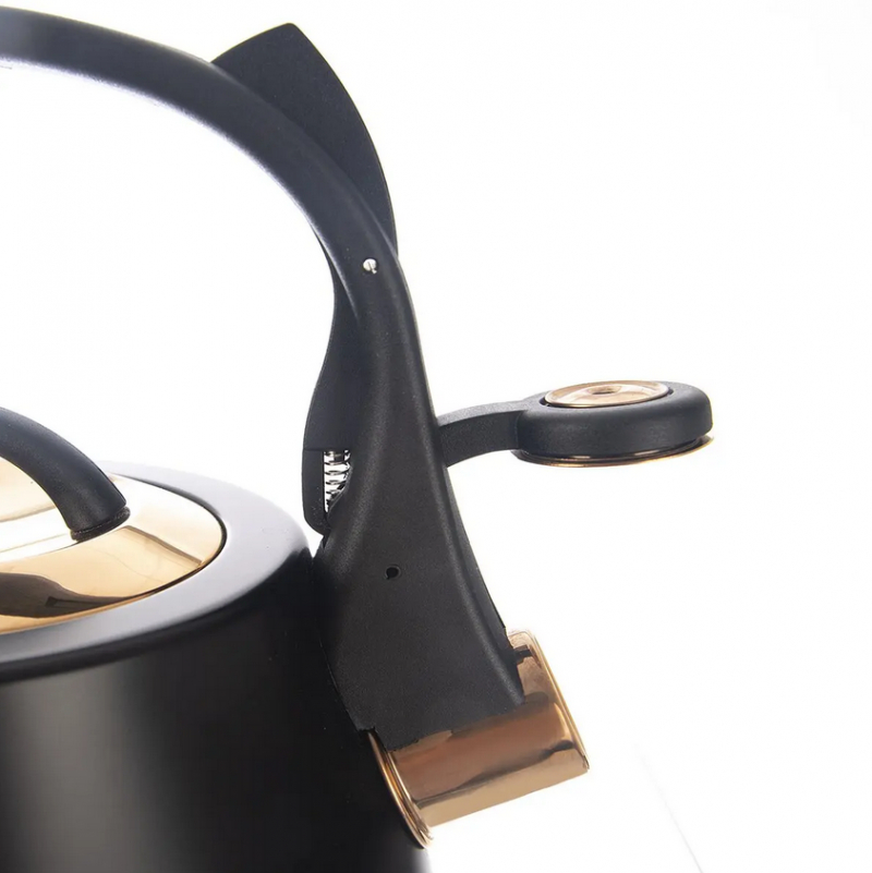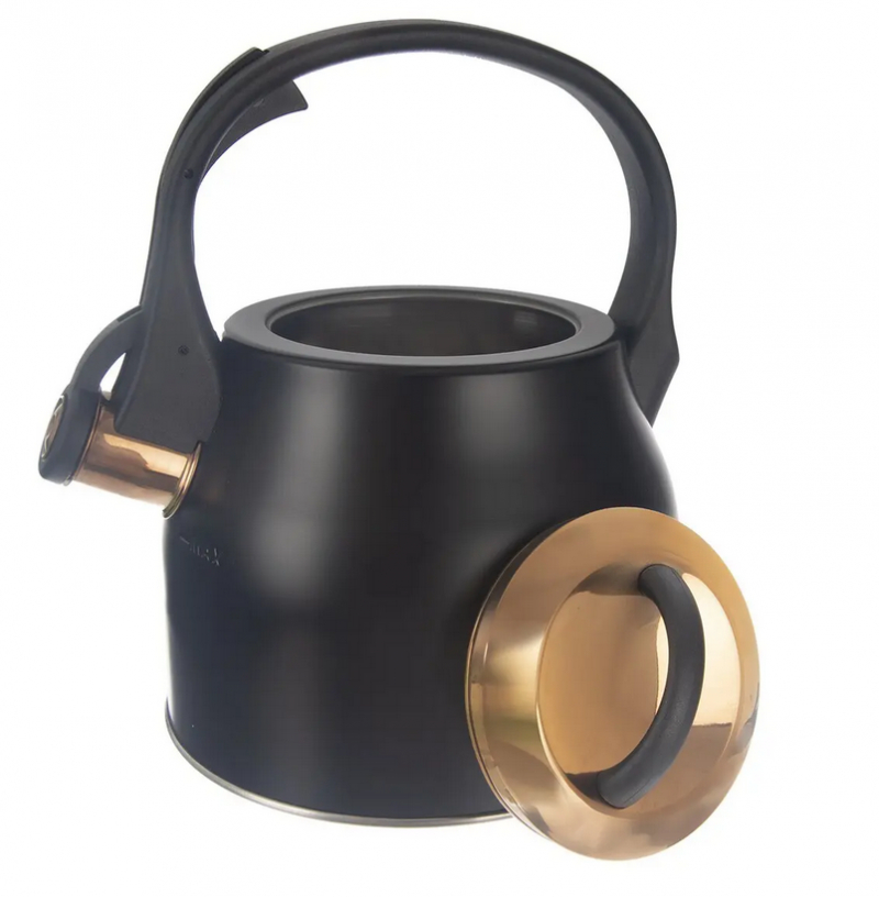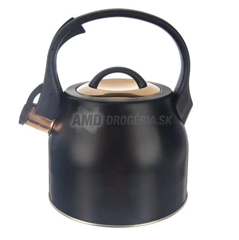 Štýlový čierny čajník s odklápacou píšťalkou, ktorá jasne ohlási vriacu vodu. Rovné dno rýchlo rozvádza teplo pre ohrev na čaj či kávu na všetkých sporákoch vrátane indukcie.Úžitkový objem 1,84 l s vyznačenou mierou na vonkajšej strane a širokým otvorom pre pohodlné plnenie – jednoducho sňať nerezové viečko v zlatom ružovom odtieni. Praktická nylonová rukoväť uľahčuje manipuláciu pri plnení aj vylievaní.
