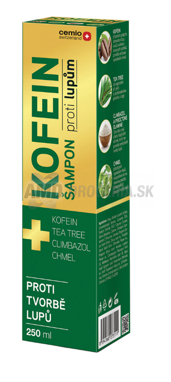 Cemio šampón Kofeín proti lupinám by mal byť prvou voľbou pre všetkých, ktorých trápi nadmerná tvorba lupín a suchá pokožka hlavy sprevádzaná svrbením a podráždením. Vďaka obsiahnutým zložkám pokožku upokojuje a zamedzuje ďalšej tvorbe lupín. Osvedčená kombinácia kofeínu a chmeľu pomáha v boji proti vypadávaniu vlasov, tea tree olej napomáha pri starostlivosti o problematickú pokožku s lupinami.