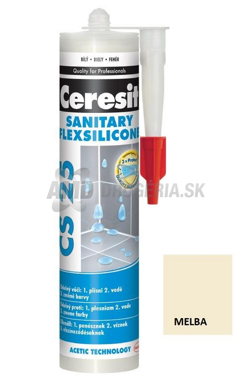 Ceresit CS 25 melba sanitárny silikón je určený na výrobu spojovacích škárov medzi keramickými obkladmi a dlažbami v rohoch alebo pri styku stien a podláh. Taktiež sa používa na osadzovanie zriaďovacích predmetov v sanitárnej oblasti. Jeho receptúra Microprotect obsahuje trojnásobne väčšie množstvo účinných látok, ktoré chránia pred vznikom plesní. Vďaka efektu aquastatic nedochádza k hromadeniu kvapiek vody na povrch škára, čo zabezpečuje dlhodobú ochranu pred plesňami a používaním nosenia. Silikón sa vynikajúco priľná k suchým aj nenasiakavým materiálom, ako sú sklo, keramika, porcelán, pórovina a email. Je dôležité si uvedomiť, že sanitárny silikón nie je vhodný na použitie v nádržiach na pitnú vodu a na lepenie materiálov, ktoré sú vhodné pre koróziu (olovo, zinok, meď, železo), ako sú akváriá, zrkadlá a kovové povrchy.