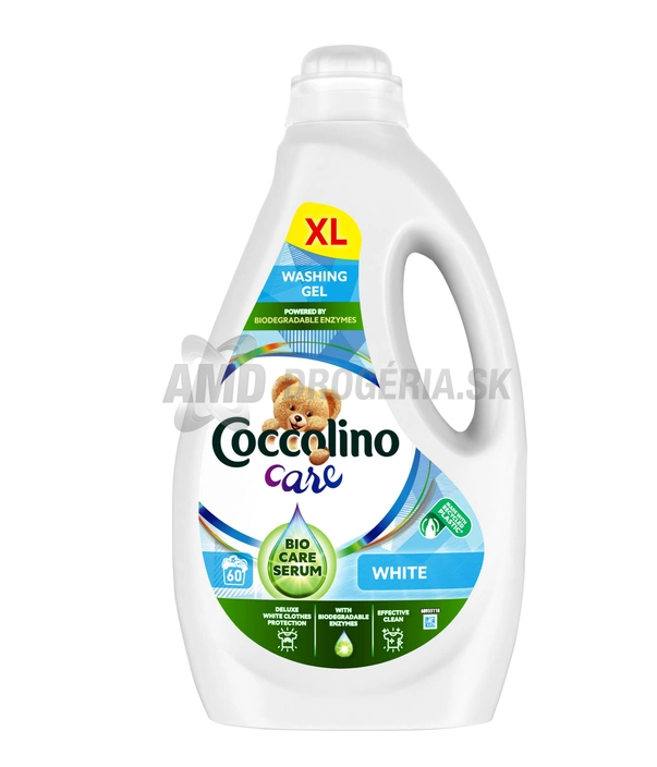 Nový špeciálny tekutý prací prípravok COCCOLINO Care Biela bielizeň účinne perie, stará sa o vašu bielizeň a chráni vaše oblečenie.