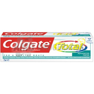 Je klinicky overené, že zubná pasta Colgate Total Advanced Fresh pôsobí proti nepríjemnému zápachu z úst.Colgate Total obsahuje špeciálnu kombináciu triklosanu / kopolyméru a fluóru.Toto zloženie zabezpečuje 12 - tich hodinovú antibakteriálnu ochranu a účinne bojuje proti chorobám zubov a ďasien.Colgate