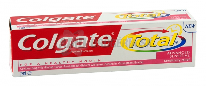 Colgate Total Sensitive pre kompletný 12-tich hodinovú ochranu.Unikátne antibakteriálne zloženie od Colgate Total pomáha odstraňovať baktérie plaku z povrchu zubov a ďasien.