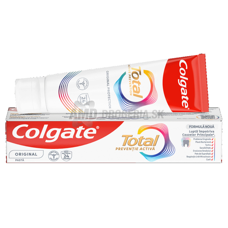 Colgate zubná pasta Total Original poskytuje celkovú ochranu pre zdravšiu ústnu dutinu. Efektívne chráni váš chrup je pred zubným kazom a rieši problémy s citlivými ďasnami. Zároveň pomáha znižovať množstvo baktérií na zuboch, jazyku, slizniciach a ďasnách.