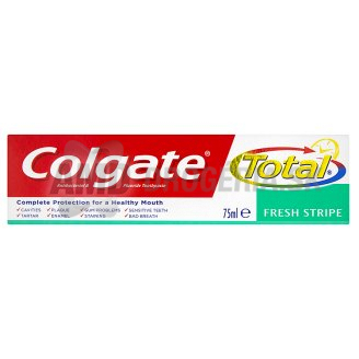 Colgate zubná pasta Total Fresh Stripe 75ml svěžující mätová príchuťou pre sebavedomie sviežeho dychu. Neviditeľné baktérie začínajú rásť v ústach ihneď po čistení zubov a môžu spôsobiť veľa problémov v dutine ústnej. Vylepšené zloženie zubnej pasty Colgate Total Fresh Stripe má unikátny systém pre boj s baktériami, ktorý zostáva vo Vašich ústach a pomáha bojovať s problémami ako sú zubný povlak a zápal ďasien, pre nepretržitú 12 hodinovú ochranu.