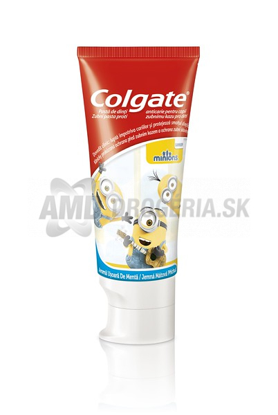 Detská zubná pasta Colgate Minions so sviežou mätovou príchuťou čistí zuby detí vo veku od 6 rokov. Zloženie s obsahom fluoridu sodného posilňuje zubnú sklovinu a prispieva k prevencii zubného kazu.