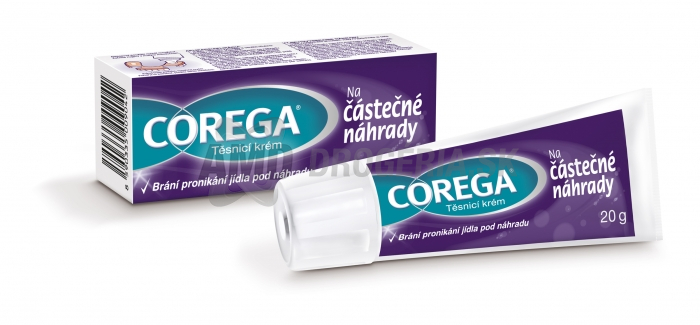Zaručuje spoľahlivé upevnenie zubnej náhrady po celý deň. Aj keď Vám náhrada sedí dobre, krém Corega ju utesní, a tak zabráni Zaručuje spoľahlivé upevnenie zubnej náhrady po celý deň. Aj keď Vám náhrada sedí dobre, krém Corega ju utesní, a tak zabráni nepríjemnému zanášanie zvyškov jedla pod náhradu. Neobsahuje žiadne umelé farbivá ani príchute, ktoré by mohli ovplyvniť chuť jedla. Praktický tvar hrdla tuby umožňuje presnejšie dávkovanie a nanášanie krému.Znižuje množstvo zvyškov jedla prenikajúcich pod zubnú náhradu.Obmedzuje pohyblivosť zubné náhrady a zaisťuje jej stabilitu.Zvyšuje pocit pohodlia, sebadôvery a spokojnosti.Bolo klinicky dokázané, že fixačný krém Corega na čiastočné náhrady zníži množstvo zvyškov jedla zachytených pod protézou na 57%, zlepší pocit pohodlia, sebadôvery a poskojenosti.Neobsahuje zinok. Malé percento populácie môže vykazovať citlivosť na liek alebo mať po použití alergickú reakciu. Ak zaznamenáte alergickú reakciu alebo nepohodlie, okamžite prestaňte výrobok používať. Pri bežnom používaní podľa návodu dochádza k prehĺtaní malého množstva lieku, ktoré nie je škodlivé. Uchovávajte mimo dosahu detí. Ak prípravok používate prvýkrát, prečítajte si, prosím, pozorne priložený príbalový leták s detailným návodom na použitie.Zubnú náhradu je nutné dokonale očistiťNa náhradu nanesieme tri tenké prúžky krému cca 4cm dlhéNáhradu nasadiť do úst a na chvíľu pevne pritlačiťZvyšky krému možno po jej vybratí z úst odstrániť pomocou papierovej vreckovky napusteného olejom. Zloženie fixačného krému CoregaPoly (metylvinyléteru / maleic acid) sodium-magnézium-zinc mixed partial salt, petrolát, celulóze gúm, paraffinum liquidum, silica, poly (metylvinyléteru / maleic acid), mentol, menthyl lactate, aróma, CI 45430