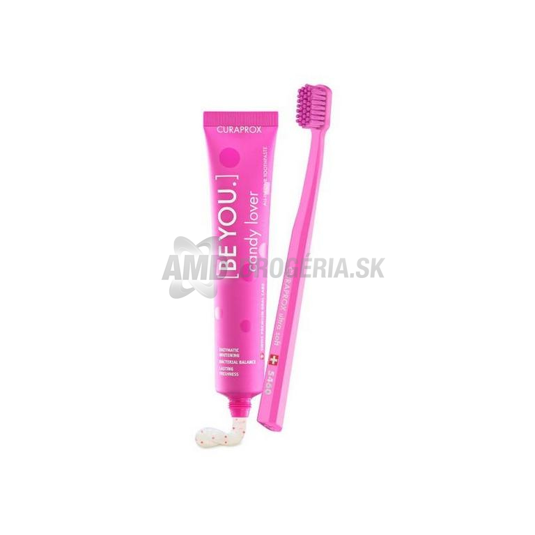 Balíček obsahuje zubnú pastu s príchuťou červený melón a zubnú kefku.
