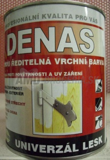 DENAS UNIVERZÁL LESK, MAT je vodou riediteľná vrchná krycia farba na báze akostnej akrylátovej disperzie obsahujúce stálofarebné pigmenty, jemná plnivá, biocídne prostriedky, koalescenty a ďalšie prísady, upravujúce jej vlastnosti. Ako riedidlo obsahuje vodu, neobsahuje žiadne aromatické rozpúšťadlá ani lakový benzín. Vrchný krycie nátery kovových a drevených výrobkov, konštrukcií a materiálov v exteriéroch aj interiéroch. Najčastejšie úpravy dverí, zárubní, zábradlí, obkladov, záhradného nábytku, plechových striech a podTeplota vzduchu a podkladu pri nanášaní a schnutí náteru nesmie klesnúť pod + 10 ° C.Vlastnosti:Hustota: 1,2 - 1,3 g/cm3Hmotnostná sušina: 40 - 50%pH 8 - 10Objemová sušina: 30 - 40%Náter má vynikajúcu odolnosť proti kriedovanie a krehkosť pri pôsobení UV žiarenia a poveternostných vplyvov, odolnosť proti pôsobeniu čistiacich prostriedkov používaných v domácnosti aj iných chemických prípravkov a dlhú životnosť v interiéri aj exteriéri. Email sa vyznačuje rýchlym schnutím a nelepivosti povrchu.Chemické zaradenie: Vodou riediteľnéAplikačná vrstva: Vrchný krycí náterTónovania v systéme: CSA Eurotrend, STNVzhľad povrchu: Lesklý | Hladký, Hodvábny | MatnýPríklady použitia na kovy:Príklad použitia na strechy:Použitie na drevo | krycie nátery.Balenie: Obaly s hmotnosťou 0,7 kg, 3 kg, 10 kg, 20 kg.Výdatnosť: 7 - 10 m2 / kg na jednu vrstvu.Pracovný postup: Kovové podklady je nutné opatriť základným náterom (odporúčame DENAS ANTIKOR). U drevených podkladov sa ako základná farba uplatňuje DENASCOAT UNIVERZÁL riedený v pomere 1:1 s vodou. Pri aplikácii na drevo v exteriéri použite vhodné vodou riediteľné napúšťalo s biocídnym účinkom. Ďalšie vrstvy sa nanáša štetcom, valčekom alebo vzduchovým striekaním v jednej, alebo dvoch vrstvách v dodanej konzistencii bez riedenia. Teplota vzduchu a podkladu pri nanášaní a schnutí náteru nesmie klesnúť pod + 10 ° C.Podklad: Podklady musia byť suché, zbavené mechanických aj mastných nečistôt a zvyškov starých náterov nesúdržných s podkladom.Skladovanie: Farba sa skladuje v pôvodných obaloch pri teplotách +5 až + 25 ° C, skladovateľnosť min. 36 mesiacov od dátumu výroby.Farba nesmie zmrznúť.