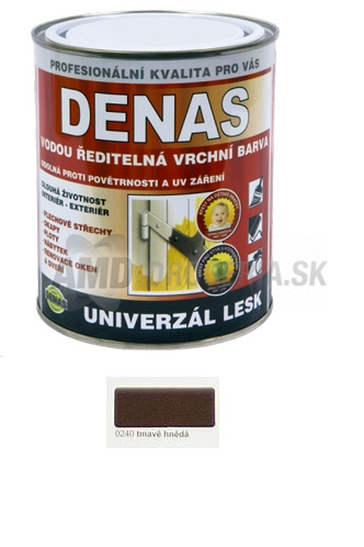 DENAS UNIVERZÁL (LESK, MAT) je vodou riediteľná vrchná krycia farba na báze akostnej akrylátovej disperzie obsahujúce stálofarebné pigmenty, jemná plnivá, biocídne prostriedky, koalescenty a ďalšie prísady, upravujúce jej vlastnosti. Ako riedidlo obsahuje vodu, neobsahuje žiadne aromatické rozpúšťadlá ani lakový benzín.