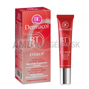 Intenzívny liftingový krém na oči a pery Dermacol BT Cell Eye Lip Intensive Lifting Cream.Jedinečný liftingový krém Dermacol BT Cell Eye Lip Intensive Lifting Cream s koncentrovaným protivráskovým komplexom má účinok ako botox. Už druhý deň znateľný výsledok v okolí očí a pier: redukcia hĺbky vrások o 20% a ich povrchu o 36%. Dlhodobo zvyšuje pevnosť, obnovuje plnosť pleti a redukuje nerovnosti. Pleť je po ošetrení krémom upokojená, zvláčnená a chránená pred voľnými radikálmi. Pre všetky typy pleti. Bez parfumace.Doporučujeme používať od 30 rokov, ideálne v kombinácii s krémom Botocell Intenzívny liftingový krém.