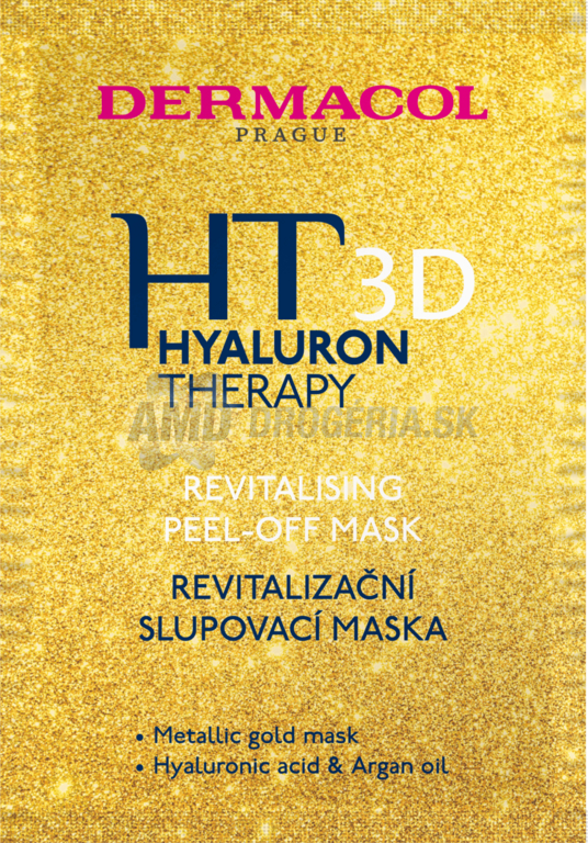 Revitalizačná zlupovacia pleťová maska HT 3D Hyaluron Therapy od Dermacol vašu pleť rozžiari a skvele hydratuje. Potlačí známky únavy a dodá jej hebkosť. Revitalizačná formula s kyselinou hyalurónovou, arganovým olejom, extraktom z hnedej morskej riasy a pantenolom je to pravé pre vašu pleť. Po aplikácii získate pevnú a jemnú pleť. Navyše obsahuje jemné zlaté, perleťové pigmenty, ktoré zjemnia póry a krásne pleť oživia. Mdlá pleť bude minulosťou, stačí jej dopriať pleťovú starostlivosť s Dermacol!
