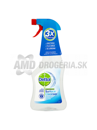 Čistiaci sprej DETTOL Antibakteriálny sprej na povrchy 500 ml: Antibakteriálny čistiaci sprej je nepostrádateľným pomocníkom v každej domácnosti. Rýchlo a spoľahlivo zbaví tvrdý neporézny povrch všetkých baktérií a vírusov. Ničia 99,9% baktérií a vírusov, odstraňuje nebezpečenstvo v podobe E. coli, Salmonelly, MRSA, Listeria a vírusu chrípky. Sprej môže byť bez obáv použitý na čistenie okolo detského vybavenia a plôch, kde pre deti pripravujete pokrmy.