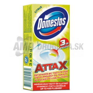 DOMESTOS WC STICK CITRUS 3 KS,1 KS. Ako je známe, toaleta je obľúbeným útočiskom všetkých možných baktérií, ktoré vedia z misy uraziť vzdialenosť až niekoľkometrov a pochutnať si tak aj na vašej zubnej kefke.Práve preto by ste vašu toalete mali venovať zvýšenú pozornosť, pravidelne ju dezinfikovať a vybaviť vhodným WC blokom.Vyskúšajte silu značky Domestos v podobe revolučného čistiaceho WC prúžku Domestos ATTAX! Nový DomestosATTAX sa jednoducho aplikuje, vydrží až 150 spláchnutí a po celú dobu udrží vašu toaletu sviežou a čistou!Nová generácia WC blokov Domestos ATTAX uľahčuje moderným ženám starostlivosť o čistotu toalety.Gélový prúžok sa jednoducho prilepí na suchú časť toaletnej misy, kde potom vydrží až 150 spláchnutí!Po tejto dobe nemusíte prúžok z misy zložito odstraňovať a dotýkať sa tak baktérií, stačí ho štetkou odlepiť a spláchnuť.Vďaka 5% obsahu parfumu si prúžok udrží po celú dobu pôsobenia príjemnú vôňu!