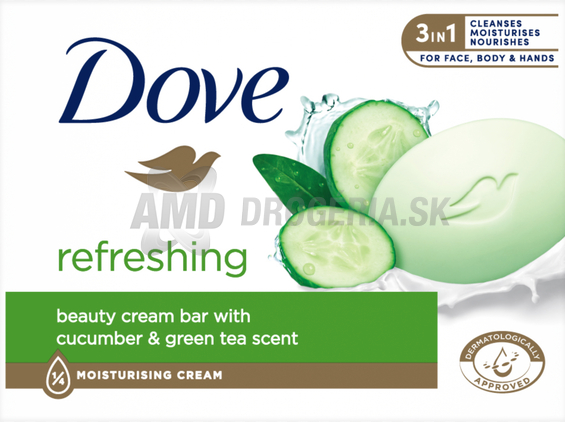 Dove krémová tableta Svieži dotyk obsahuje kombináciu osviežujúcich výťažkov z uhorky s extraktom upokojujúceho zeleného čaju a, samozrejme, 1/4 hydratačného krému.