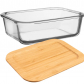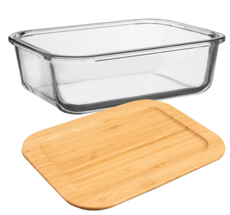 Sklenená dóza s viečkom je skvelým pomocníkom pre uloženie, ohrievanie (bez viečka) a zapekanie (bez viečka) potravín. Viečko je vybavené silikónovým tesnením a môže byť využité aj ako podtácku alebo doska. Vďaka priehlbine vo viečku sú dózy stohovateľné, čo uľahčuje ich uskladnenie. Borosilikátové sklo dózy je odolné voči vysokým teplotám, takže v ňom môžete bezpečne ohrievať potraviny a zapekať ich v klasickej rúre. Sklo nepreberá farbu, chuť ani arómu z uložených potravín a ani pri dlhodobom uchovaní potravín neovplyvňuje ich kvalitu. Dózy tiež umožňujú uchovávanie pripravených jedál v chladničke. Materiál zahŕňa borosilikátové sklo (s použitím od –20 °C do 220 °C), bambusové drevo a silikón. Rozmery dózy sú 0,6 l objemu a 17x12,5x5,5 cm. Možno ich umývať v umývačke riadu (bez viečka) a použiť v klasickej rúre aj mikrovlnke (bez viečka).