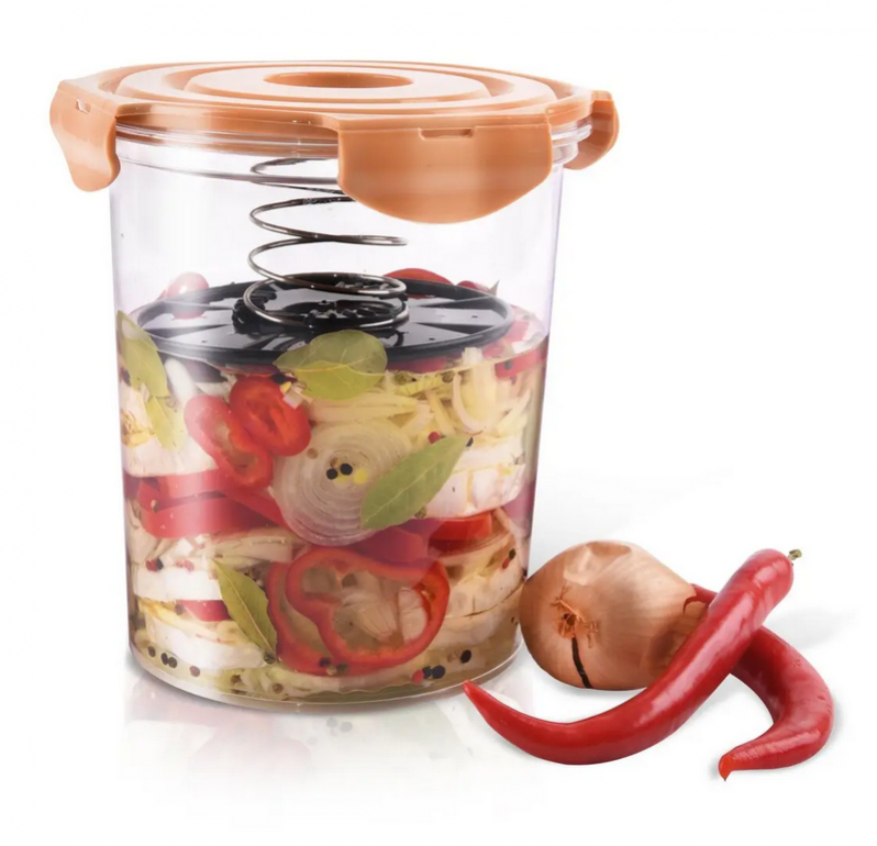 Viečko s nerezovou pružinou: stlačí obsah, šetrí marinádu/olej, zintenzívni chute (syry perfektne preležia v oleji)