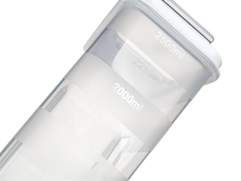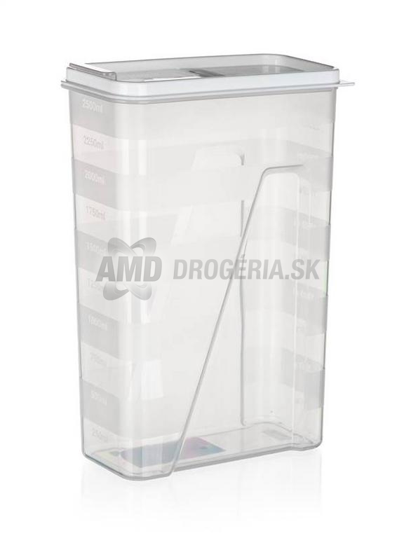 Transparentná dávkovacia plastová dóza Culinaria s objemom 2,5 l, s viečkom v bielej farbe. Dóza je praktickým pomocníkom na ukladanie cestovín, strukovín, múky a iných potravín. Vybavená meracou ryskou s odstupom 250 ml.