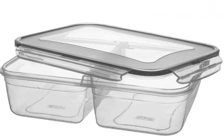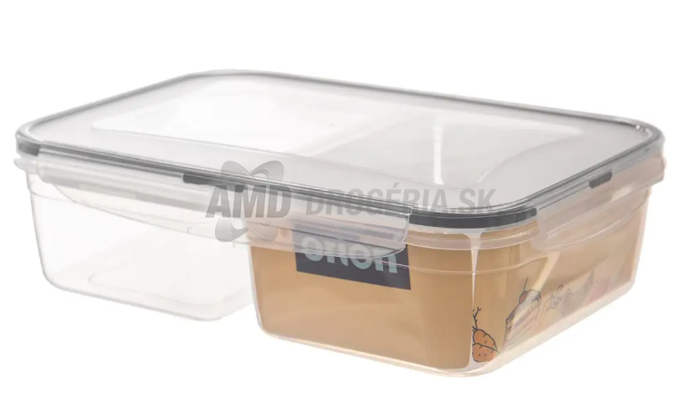 Plastová hranatá dóza s transparentným dizajnom je vybavená silikónovým tesnením vo viečku a klipmi pre pevné uzavretie, čo zabezpečuje bezpečné uskladnenie potravín a jednoduché prenášanie. Vo vnútri má 2 menšie misky, ktoré umožňujú oddelenie potravín. Dóza je stohovateľná a vhodná do chladničky, do mikrovlnnej rúry (bez viečka) aj do umývačky riadu. Je odolná voči teplotám od -25 °C do 95 °C.