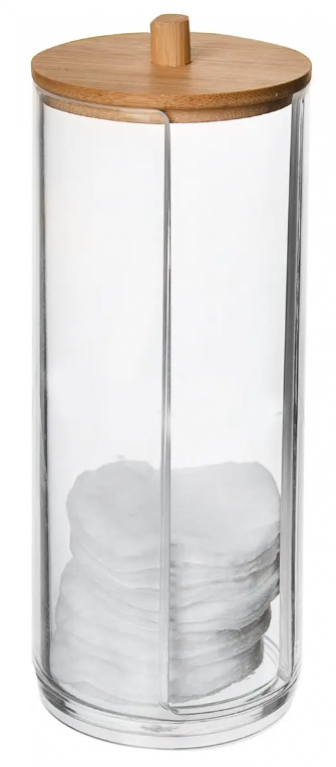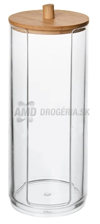 Dóza na vatové tampóny s viečkom je praktickým pomocníkom do kúpeľne, ktorý vám umožňuje jednoduchý prístup k vatovým tampónom a zároveň udržiava kúpeľňu upratanú. Je vyrobená z plastu a má dekoratívny kryt z bambusového dreva. Dizajn je transparentný, čo umožňuje ľahké sledovanie množstva tampónov v dóze. Rozmery dózy sú približne 7 cm v priemere a 17,5 cm výšky, čo je dostatočne kompaktné pre umiestnenie na vašu kúpeľňovú poličku alebo pult. Táto dóza nielenže zabezpečuje usporiadané a esteticky príjemné prostredie vo vašej kúpeľni, ale tiež udržuje vaše potreby na hygienu na dosah ruky.