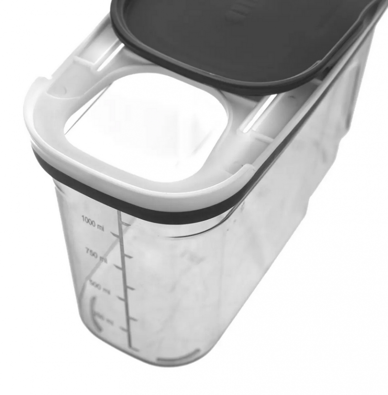 Odmerná stupnica po 250 ml na užšej strane vám prehľadne ukáže, koľko obsahu zostáva – žiadne prekvapenia pri varení. Posuvný dávkovač zaisťuje presné porcie bez rozsypávania.