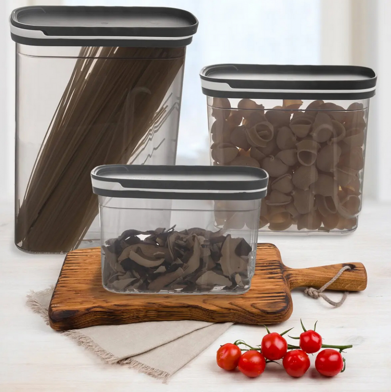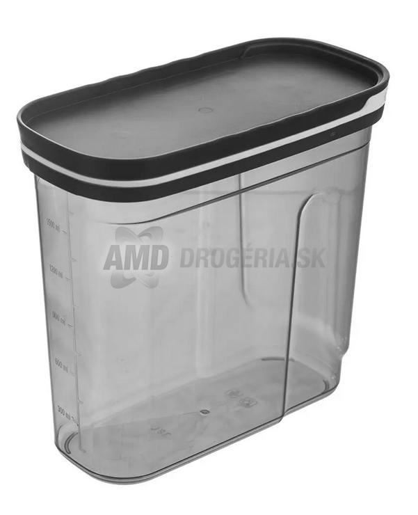 Polopriehľadná plastová dóza s posuvným dávkovacím uzáverom 1,8 l v dymovom odtieni (z odolného PP a TPE plastu) – skvelá na cestoviny, múku, strukoviny, strúhanku, cereálie či ryžu.