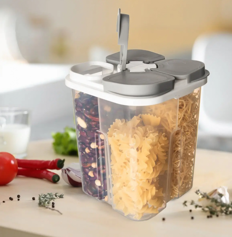 Delená dóza s dávkovacími uzávermi je praktickým riešením na uskladnenie múky, cukru, strukovín, cereálií a ďalších potravín. Je ideálna pre malé kuchyne, karavany, dovolenkové chaty a kempy. Dóza je rozdelená na 4 samostatné sekcie, čo umožňuje oddelené uskladnenie rôznych druhov potravín. Vyrobená je z plastu PP, čo zabezpečuje odolnosť a dlhú životnosť. Dóza má objem 2,45 litra a rozmery 13,5x13,5x16,5 cm, čo ju robí kompaktnou a ľahko prenositeľnou. Je vhodná na umývanie v umývačke riadu aj ručné umývanie (bez viečka). Táto delená dóza je praktickým a funkčným riešením pre uskladnenie potravín vo vašej kuchyni alebo na cestách.
