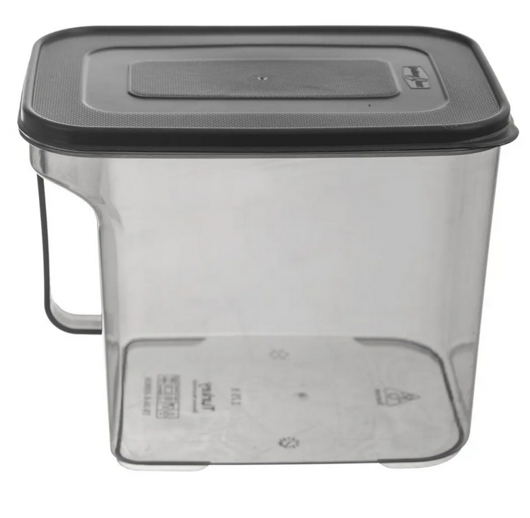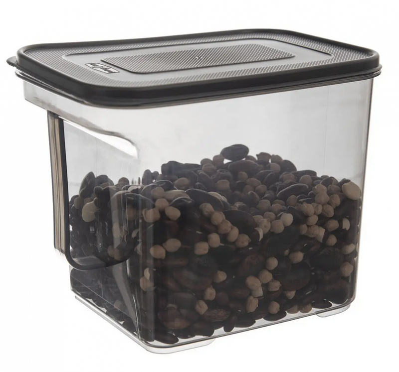Šikovná zásobnica na potraviny s viečkom a držadlom z PP plastu (dymovo transparentná) – ideálna na múku, soľ, cukor, krupicu, strúhanku, cestoviny či strukoviny.