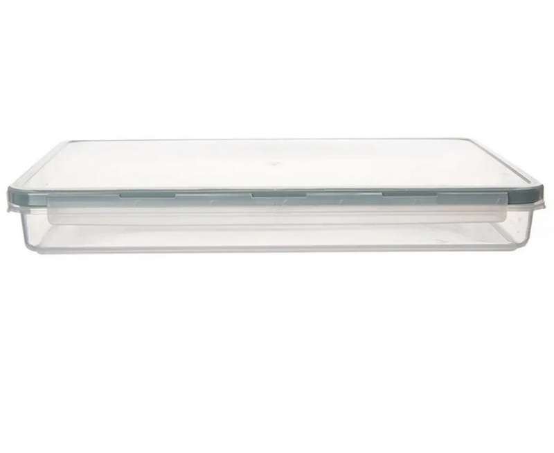 Transparentná obdĺžniková dóza výška 4,2 cm z PP plastu – univerzálna na chladničku (krájané salámy, syry), mrazničku (bobuľoviny, nakrájaná zelenina, mäso na rezne) či cesty/do práce (jablčný závin, chlebíčky, koláče, domáca pizza).