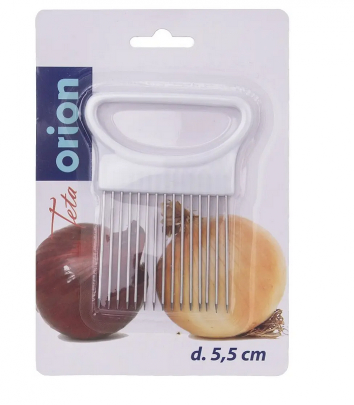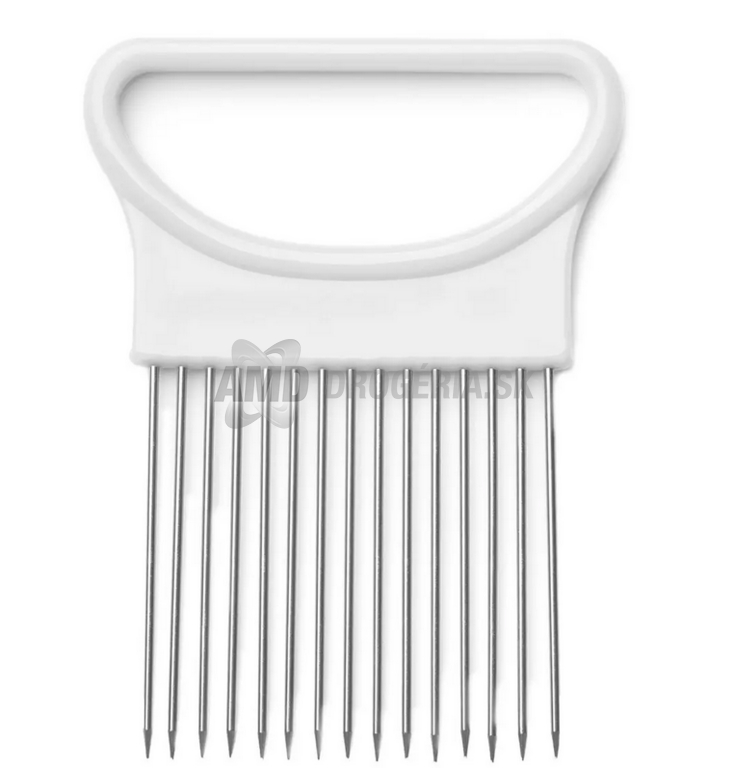 Ak nemáte pevný grip pri krájaní cibule – nechty schované a palec tlačiace cibuľu proti prstom – siahnite po tomto praktickom držiaku. Systém nerezových ihiel vsunutých do plastovej rukoväte z PS umožní najemno nakrájať cibuľu bez námahy, keďže nôž prechádza medzi ihlami. Ak nedokrojíte, rovno nakrájate drobné kocky. Dĺžka ihiel 5,5 cm postačí na akúkoľvek cibuľu.