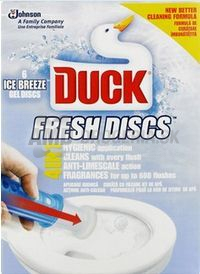 DUCK FRESH DISC ĽADOVÝ VIETOR 36 ML. Duck Fresh Discs umožňuje ľahko udržať toaletnú misu čistú a sviežu. Stačí použiť aplikátor na razítko gélu na disk vo vnútri vašej WC misy. Gél disku je umiestnený tesne pod okrajom.Nie je potrebné sa dotknúť disku alebo misy s rukami, čo umožňuje veľmi hygienickú a rýchlu aplikáciu. Gél kotúč sa postupne rozpúšťa po každom spláchnutí, umožňujúce plánované uvoľňovanie čistoty a vône.Každý disk bude trvať až sedem dní a nenecháva zvyšky. Náplň vystačí na dávkovanie 6tich diskov. Vaša WC misa zostane čistá a svieža - s malou námahou.
