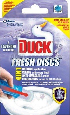 DUCK FRESH DISC LEVANDUĽA 36 ML. Po spláchnutí sa aktivuje vo WC mise ochranný štít, ktorý zabraňuje usadzovaniu vodného kamene. Čistí každým spláchnutím. Vonia až 720 spláchnutí.