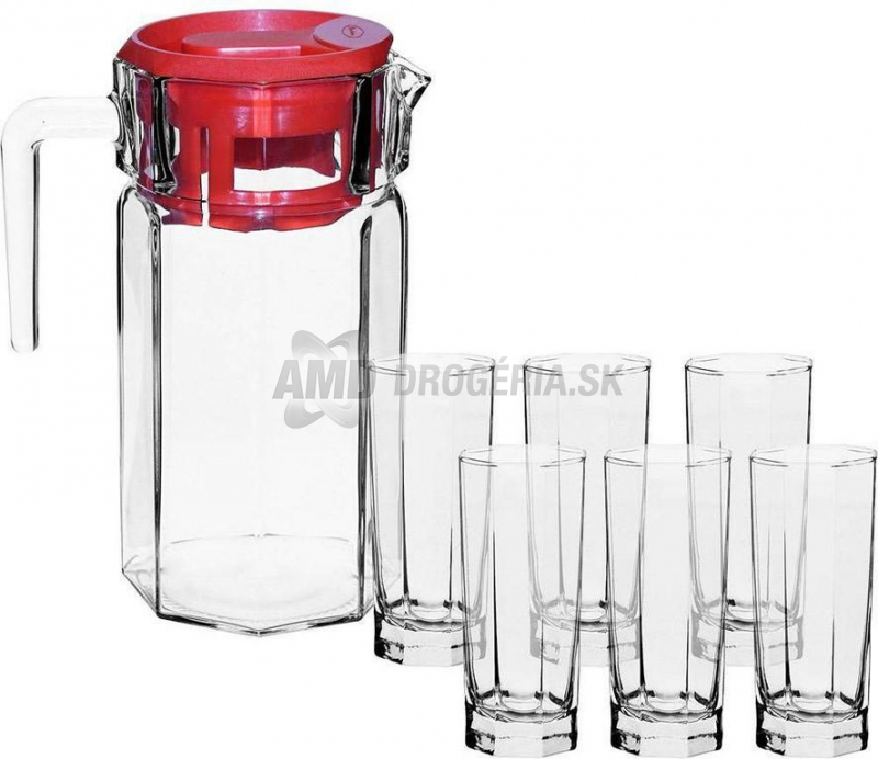 7dielny džbánový set KÖSEM obsahuje džbán 1,25 l s plastovým červeným viečkom a 6 pohárov 260 ml.