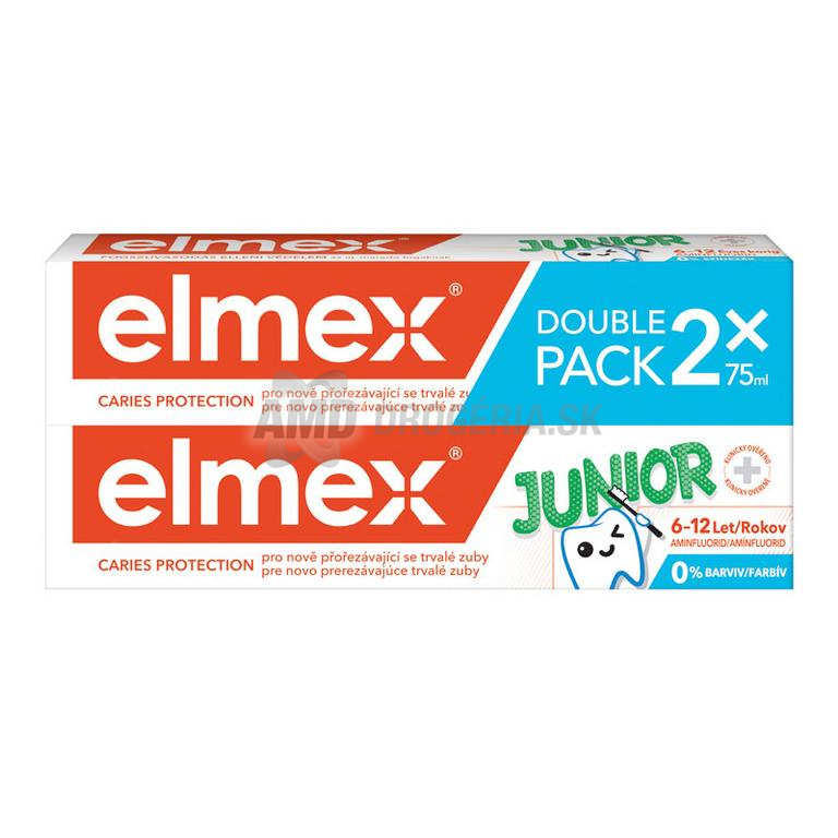 Zubná pasta ELMEX Junior duopack 2× 75 ml:Výbornou zubnou pastou pre prvé zúbky je ELMEX Junior duopack 2× 75 ml. Detský chrup je vo vývine a potrebuje rovnakú starostlivosť ako chrup dospelých. Zvlášť je dôležité u detí podchytiť pravidelnú starostlivosť o zuby. A ako inak to urobiť ako za pomoci zubnej pasty s jemnou chuťou, na ktorú sa malé deti budú každý deň tešiť.Kľúčové vlastnosti zubnej pasty ELMEX Junior duopackZubná pasta pre deti od 6 do 12 rokovS aminofluoridom pre lepšiu ochranu.