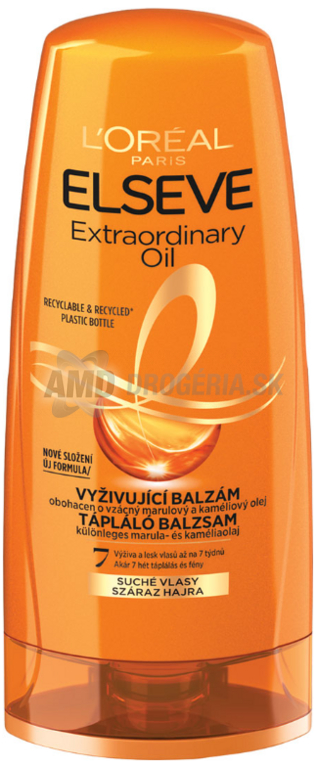 L'Oréal Paris Elseve Extraordinary Oil balzam je vyživujúci produkt určený pre suché a bez lesku vlasy. Tento balzam obsahuje vzácne oleje, ako sú marulový a kaméliový olej, ktoré dodávajú vlasom potrebné lipidy, čím ich vyživujú, zjemňujú a dodávajú im nádherný lesk.