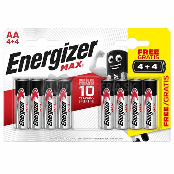 Prémiová alkalická batéria Energizer MAX AA 4+4 pre spoľahlivý a dlhotrvajúci výkon. Inovatívna technológia Energizer PowerSeal uchováva energiu po dobu 10 rokov a poskytuje vám potrebnú energiu kedykoľvek to potrebujete.