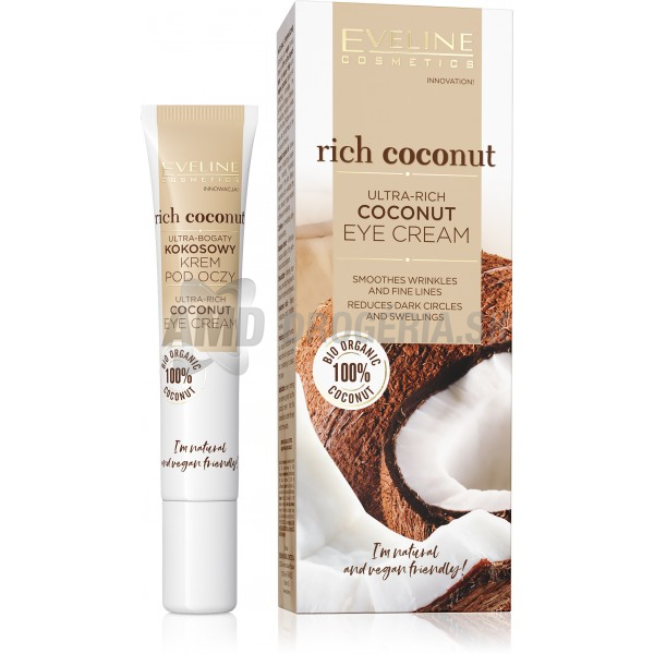 Bohatá vegánska receptúra očného krému obsahujúca 97% zložiek prírodného pôvodu je vyvinutá na báze organického kokosu. Rýchlo a efektívne eliminuje príznaky únavy, intenzívne hydratuje, redukuje vrásky a jemné linky. Obnovuje prirodzený jas a jemnosť pokožky okolo očí.